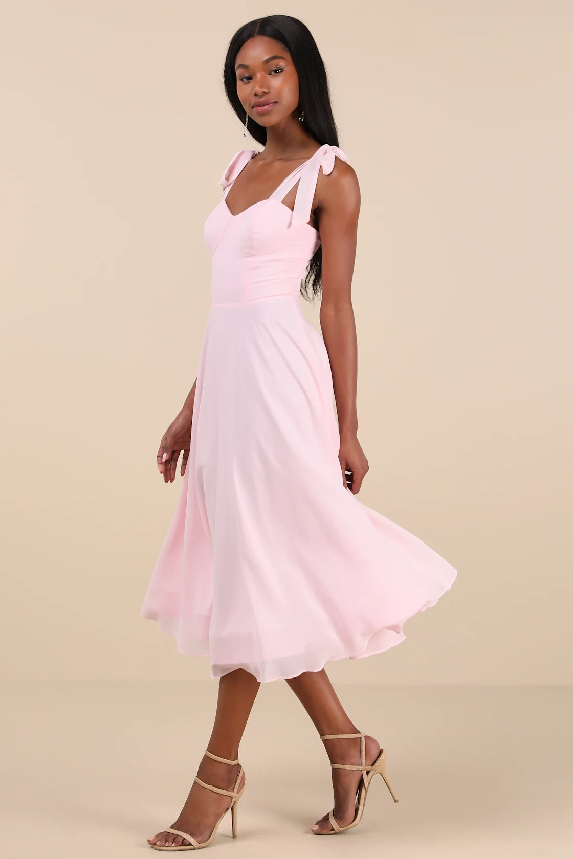 Your bubbly attitude will find a perfect match with the Lulus Sophisticated Charisma Navy Blue Tie-Strap A-Line Midi Dress! Lightweight woven chiffon shapes this darling dress that has tying shoulder straps and a bustier-inspired bodice with seamed cups and a fitted waist. Skirt has a flirty A-line silhouette, finishing at a midi hem. Hidden zipper/clasp at back.
